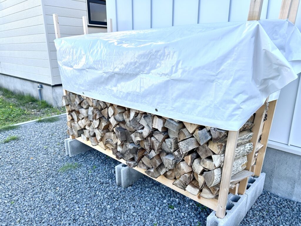 これまで既製品の薪棚を使っていたときは、すぐに満杯になってしまい、追加で小さな薪棚を置いたり、ブルーシートをかけて地面に直置きしたりしていました。